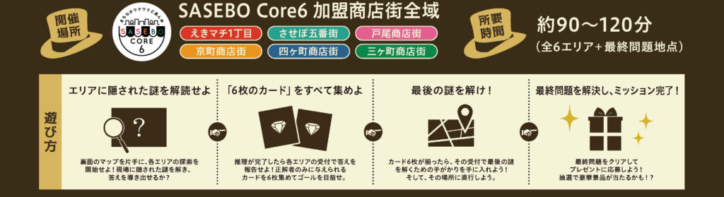 佐世保駅周辺の6つの商店街(SASEBO Core6)を歩き回り、現地に行かないと解けないアナログな謎に挑戦! 約90〜120分で街を巡り、謎を解いて地図カードをコンプリートしよう!