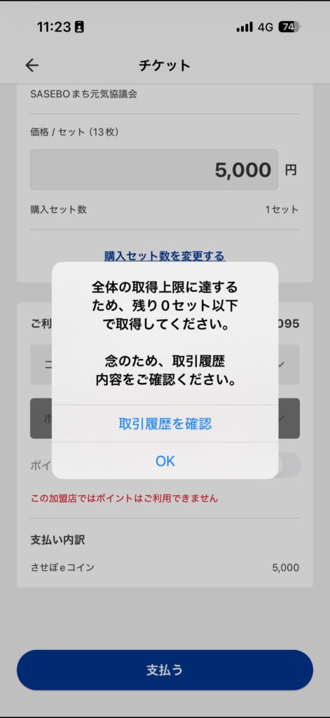 (12月17日11:40~12:30時点までは)、五番街の購入に進んだ場合、「全体の取得上限に達するため〜」といった下記画面が表示されます。